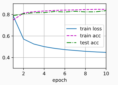 train_ch3(net, train_iter, test_iter, cross_entropy, num_epochs, updater)